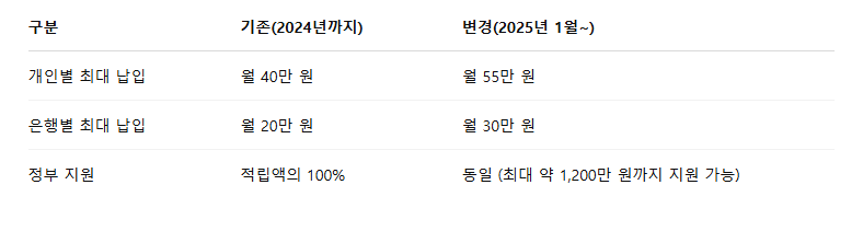 기존에는 개인당 월 최대 40만 원까지만 적금에 납입할 수 있었으나, 2025년 1월 2일부터는 최대 월 55만 원까지 납입이 가능합니다. 은행별로는 기존 20만 원 → 30만 원으로 확대되었습니다.