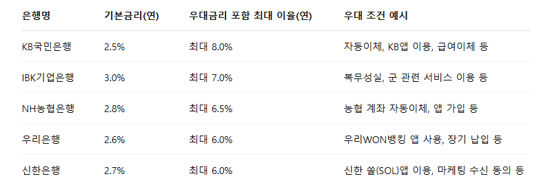 팁: 우대금리를 적용받기 위해서는 보통 모바일 앱 가입, 자동이체 설정, 군 관련 서비스 이용 등의 간단한 조건을 충족하면 됩니다.